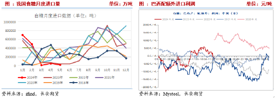 进口端,据海关数据,2024年5月我国进口食糖2万吨,同比下降1.51万吨,降幅42.96%,本榨季截至5月,我国进口食糖313.74万吨,同比增加30.92万吨,增幅10.93%。5月我国进口糖浆和预拌粉21.35万吨,同比增加6.83万吨,本榨季截至5月,我国共进口114.55万吨,同比增加32.67万吨,增幅39.89%。由于原糖反弹我国进口利润再度转负,不过考虑补充产需缺口的刚性需求,下半年我国进口仍将季节性回升,进口压力或高于上半年,并限制糖价涨幅空间。