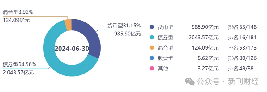 自2013年成立以来,兴业基金依托兴业银行的资源和渠道,在固收类产品上取得了显著成绩。然而,公司在权益类产品上的表现却始终不尽如人意。从业绩上看,截至2024年9月13日,兴业基金旗下的8只股票型基金(基金A和C合并计算),只有一只基金收益微正,其余7只基金累计收益均为负,且跌幅超过10%。混合型基金共有26只,表现总体好于股票,但是仍有10只基金的累计净值为负,其中5只基金的累计净值跌幅超过10%。对比权益类产品(股票型加混合型),兴业基金在债券基金方面表现强劲。公司旗下共有55只债券产品,数量是股票型基金的6倍之多。更为显著的是,除了1只基金自成立以来净值下跌,其他54只产品均实现了正收益,展现出其在债券型产品上的稳定表现和显著优势。从产品结构上看,2024年6月的数据显示,兴业基金管理的权益类基金(股票型加混合型)总规模仅为132.71亿元,而固收类产品(债券型加货币型)的规模则高达3029.47亿元,权益类产品仅占公司总资产的4.18%。下图是兴业基金产品结构分类: