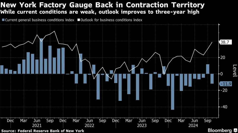 数据显示,美国10月纽约联储制造业指数(2373.946, -11.89, -0.50%)暴跌至了-11.9,预期为3.6。这份数据低于零,就表明制造业活动处于萎缩状态,而当前的报告显然低于接受调查的所有经济学家预估值。