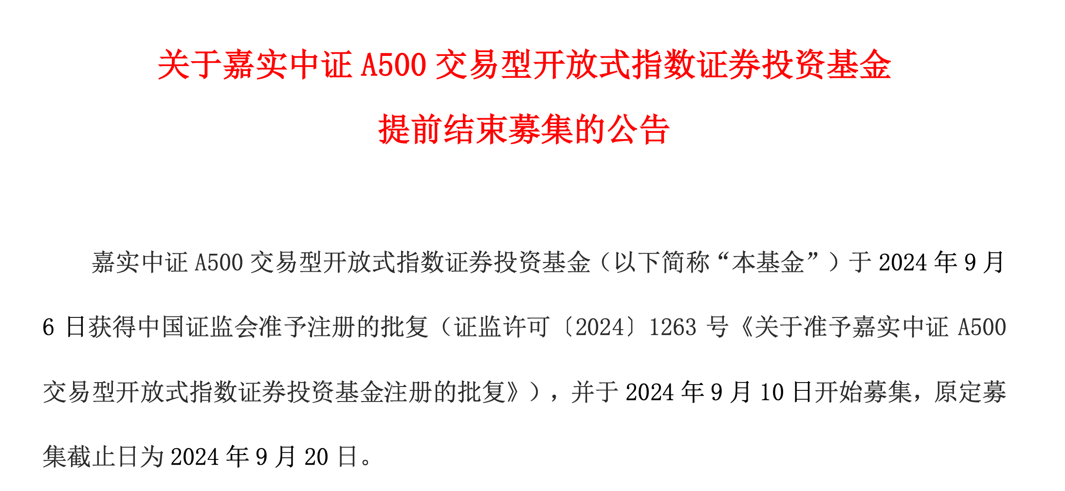 9月10日,首批中证A500ETF开卖之后,经过了三个交易日,就已经有产品提前结束募集。据嘉实基金公告,该产品已于9月13日提前结束募集,募集规模上限20亿份,而原定的募集截止日为9月20日。