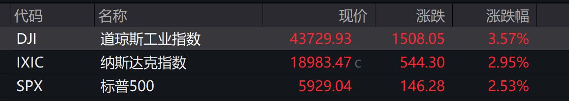 Wind数据显示,截至美股周三收盘,道指收涨1508.05点,报43729.93点,涨幅为3.57%;纳指收涨544.30点,报18983.47点,涨幅为2.95%;标普500指数收涨146.28点,报5929.04点,涨幅为2.53%。美股三大股指收盘均创历史新高,其中道指、纳指单日上涨点数为历史第四高,标普500指数单日上涨点数为历史第六高。值得一提的是,周三盘中,道指最高上涨至43778.78点,纳指最高上涨至19000.50点,标普500指数上涨至5936.14点,均创盘中历史新高。