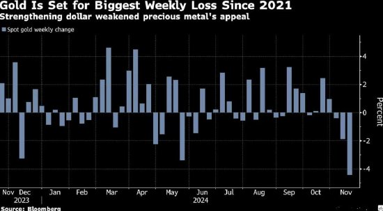 金价在连续五天下跌后保持稳定,本周跌幅料将超过4%,为2021年6月以来的最大跌幅。在鲍威尔讲话之后,交易员们降低了对12月降息的预期,对政策敏感的美国国债收益率飙升。较低的借贷成本和不断下降的收益率往往有利于黄金,因为它不支付利息。