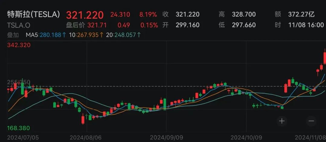 特斯拉股价强劲反弹,盘中涨幅一度扩大至10%以上,创2022年4月以来新高。收盘仍涨超8%,推动其市值重新突破万亿美元大关,达到1.03万亿美元;这也使得其CEO埃隆·马斯克的身家近3年来首次突破3000亿美元。自特朗普胜选以来,马斯克个人财富的增长额超过了彭博亿万富翁指数追踪的任何其他人。
