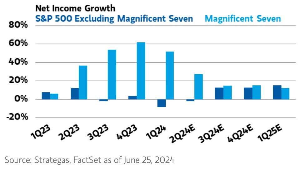 Lisa Shalett还表示,接受市场领导地位也存在风险,这源于估值。此外,她表示,现实情况是,美股“七巨头”盈利增长将大幅放缓,从而缩小支撑其优异表现的盈利增长差距。