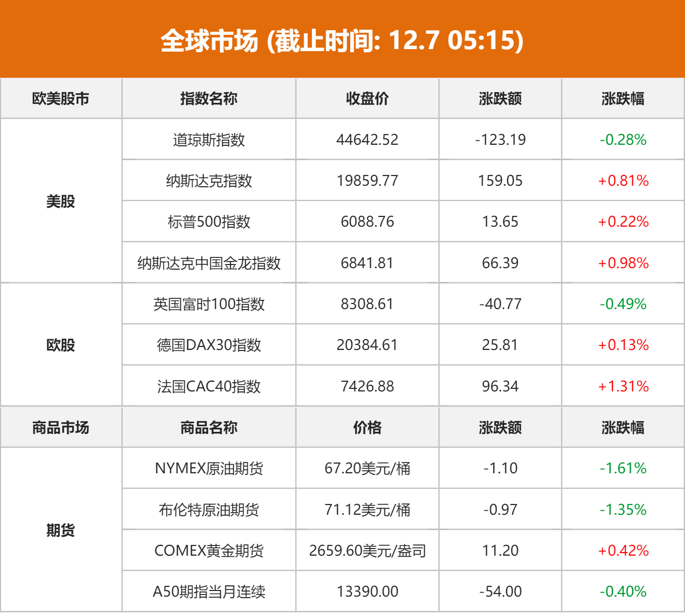 商品市场:国际油价6日下跌,截至当天收盘,纽约商品交易所2025年1月交货的轻质原油期货价格下跌1.10美元,收于每桶67.2美元,跌幅为1.61%;2025年2月交货的伦敦布伦特原油期货价格下跌97美分,收于每桶71.12美元,跌幅为1.35%。国际金价方面,COMEX黄金期货上涨11.2美元/盎司,涨幅0.42%,报2659.6美元/盎司。